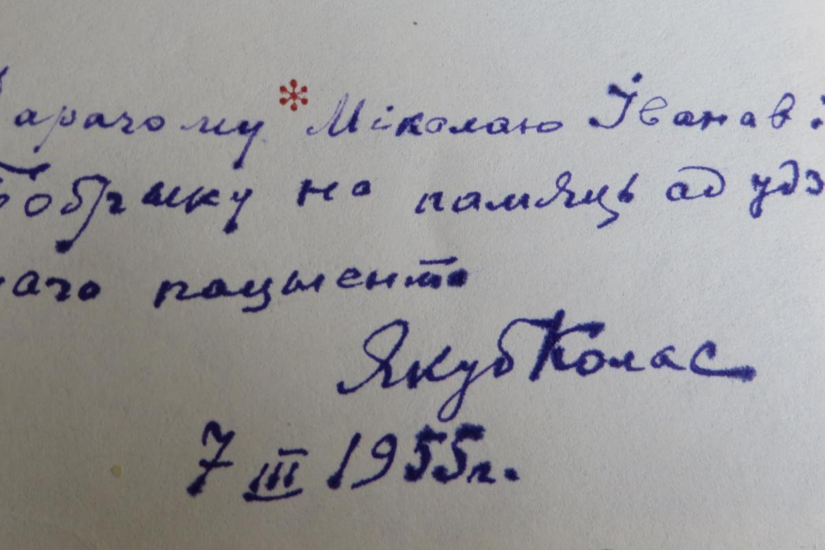 Цудоўным падарункам для дакторкі стала кніга “Рыбакова хата” з аўтографам класіка: “Дорогой Милице Ивановне Дашкевич. Якуб Колас”.