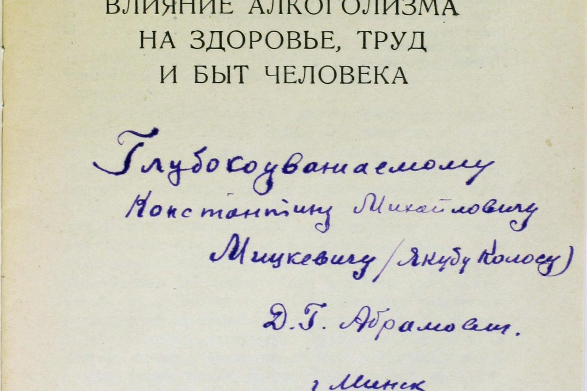 А у асабістай бібліятэцы Якуба Коласа захоўваецца кніга “Влияние алкоголизма на здоровье, труд и быт человека” (Минск, 1954 г.), якая выйшла пад рэдакцыяй доктара медыцынскіх навук, прафесара М.А.Чалісава і кандыдата медыцынскіх навук Д.Р. Абрамовіча. Напэўна Абрамовіч захацеў падзяліцца сваімі дасягненнямі з паэтам і нават пакінуў на кнізе дарчы надпіс: “Глубокоуважаемому Константину Михайловичу Мицкевичу (Якубу Коласу). Д.Г. Абрамович г. Минск, 21/ ІХ 1954 г.”.