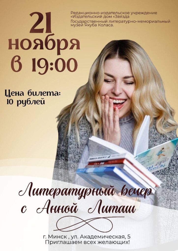 21 ноября 2025 года в 19:00 в рамках популяризации белорусской литературы РИУ «Издательский дом «Звязда» проводит литературный вечер с писательницей, военным журналистом, телеведущей, сценаристом документальных фильмов, членом Союза журналистов Беларуси, членом Союза писателей Беларуси, Заслуженным журналистом, дважды Лауреатом премии «Золотое перо» Анной Литаш.