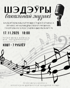 17 лістапада 2025 запрашаем усіх аматараў вакальнай музыкі на канцэрт студэнтаў класа прафесара кафедры спеваў і музычна-тэатральнага мастацтва БДАМ, Цыбульскай...